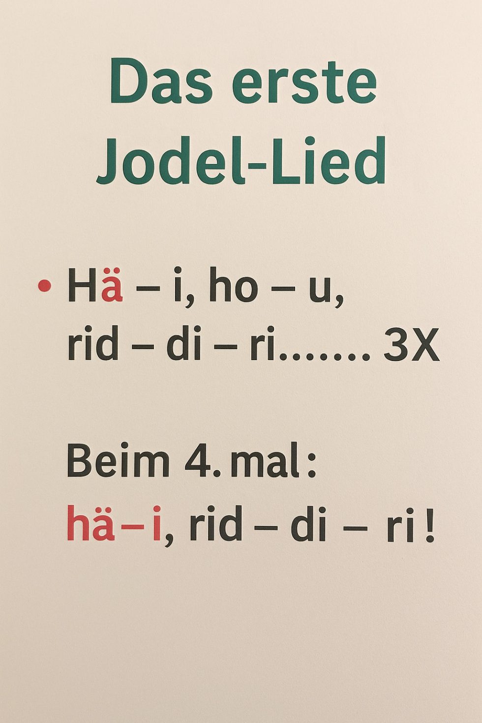 Wir lernen den Jodel-Grundschlag und darauf aufbauende Jodel-Übungen, meist nach dem Übungsheft von Barbara Lexa.